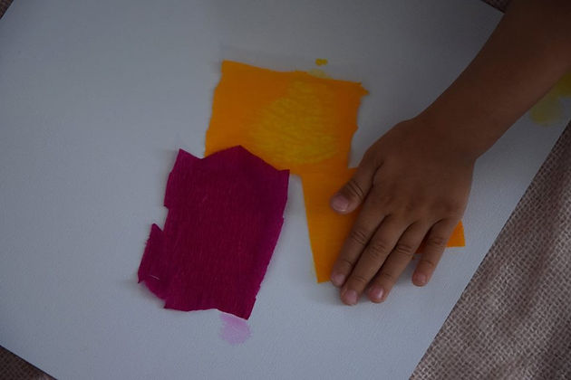 Ensuite il suffit de vaporiser de l’eau sur les petits bouts de papier crépon et de les poser sur la feuille blanche .