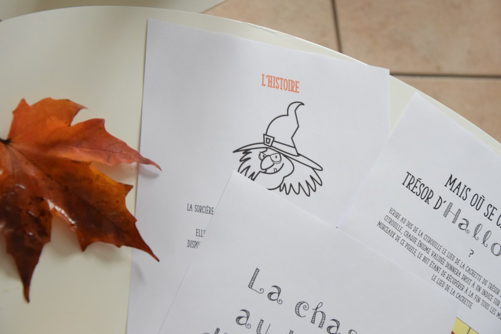 Vous pourrez télécharger le livret et ensuite l’imprimer. Au début vous trouverez une petite histoire et une image de citrouille avec des quadrillages, il faut écrire au dos le lieu de la cachette du trésor, et ensuite découper les morceaux, 15 au total.(pour le trésor on a un joli coffre que l’on remplira de bonbons).